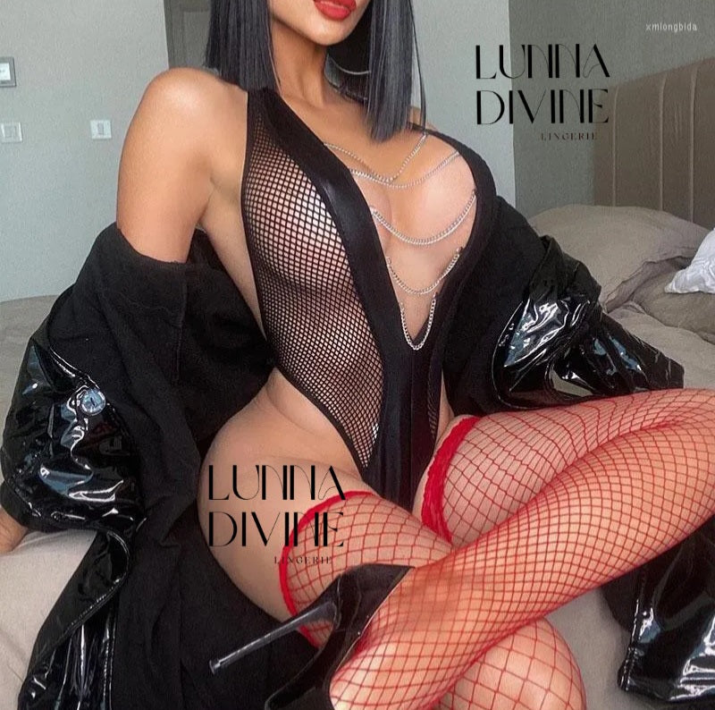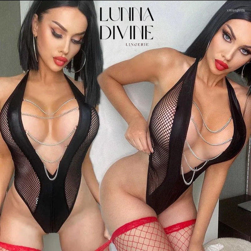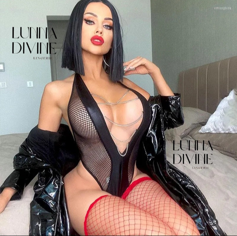 Body sexy en résille avec décolleté plongeant et string à chaines.