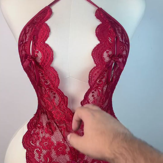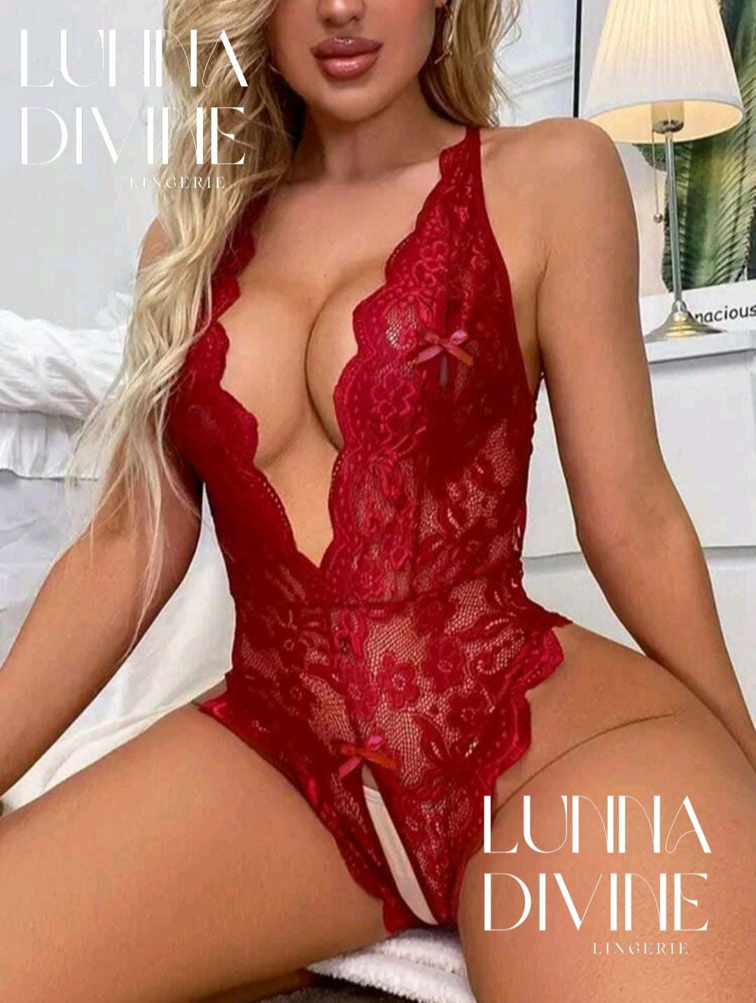 Body en dentelle, Col en V profond, design dos nu avec détails découpés, haute élasticité et silhouette ajustée, ouvert en bas.