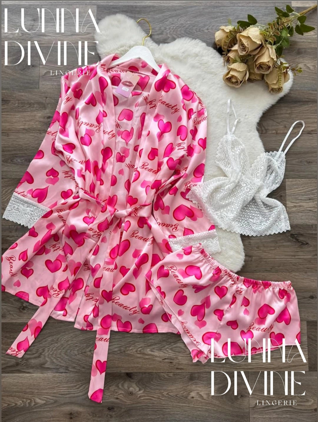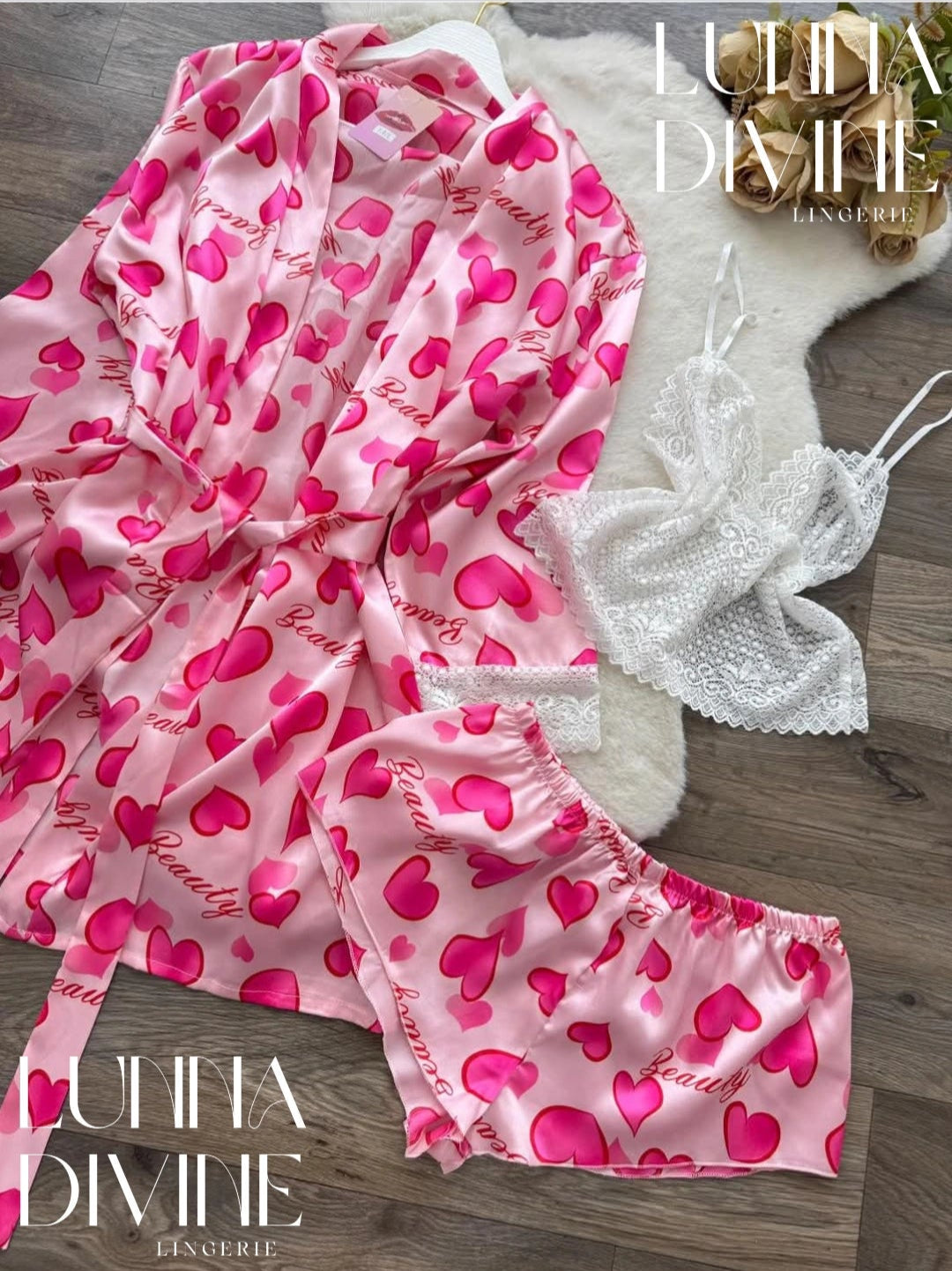 Ensemble kimono 3 pièces en satin (bustier en dentelle).