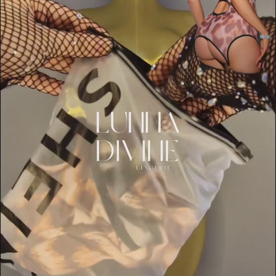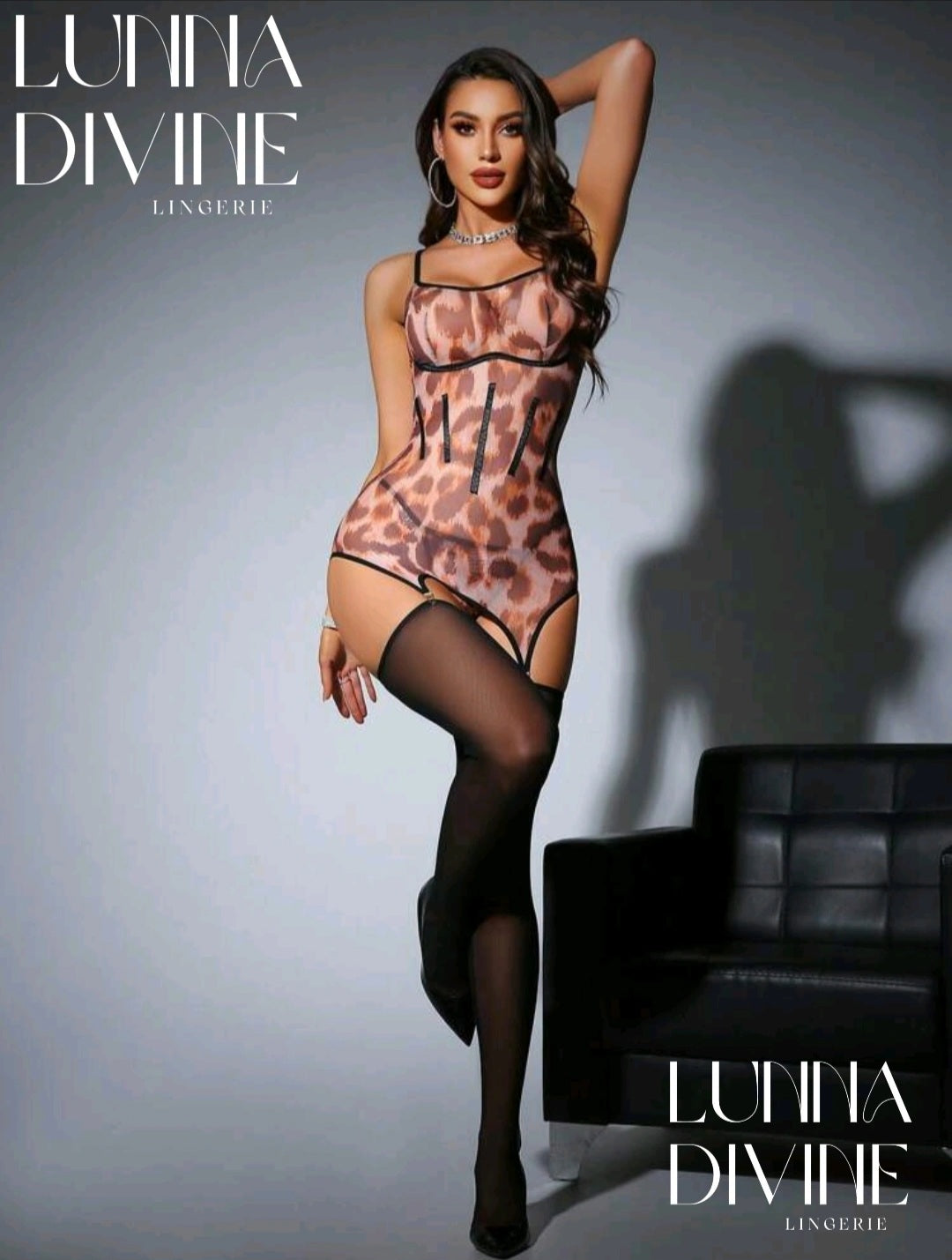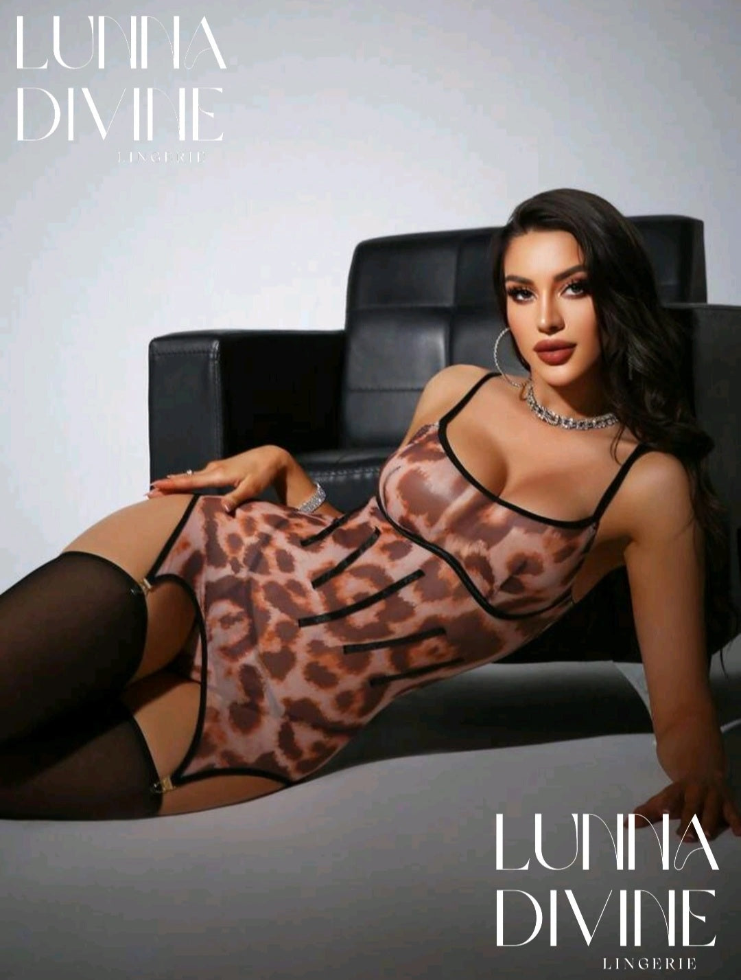 Ensemble Lingerie sexy 3 pièces, motif léopard avec string et bas.