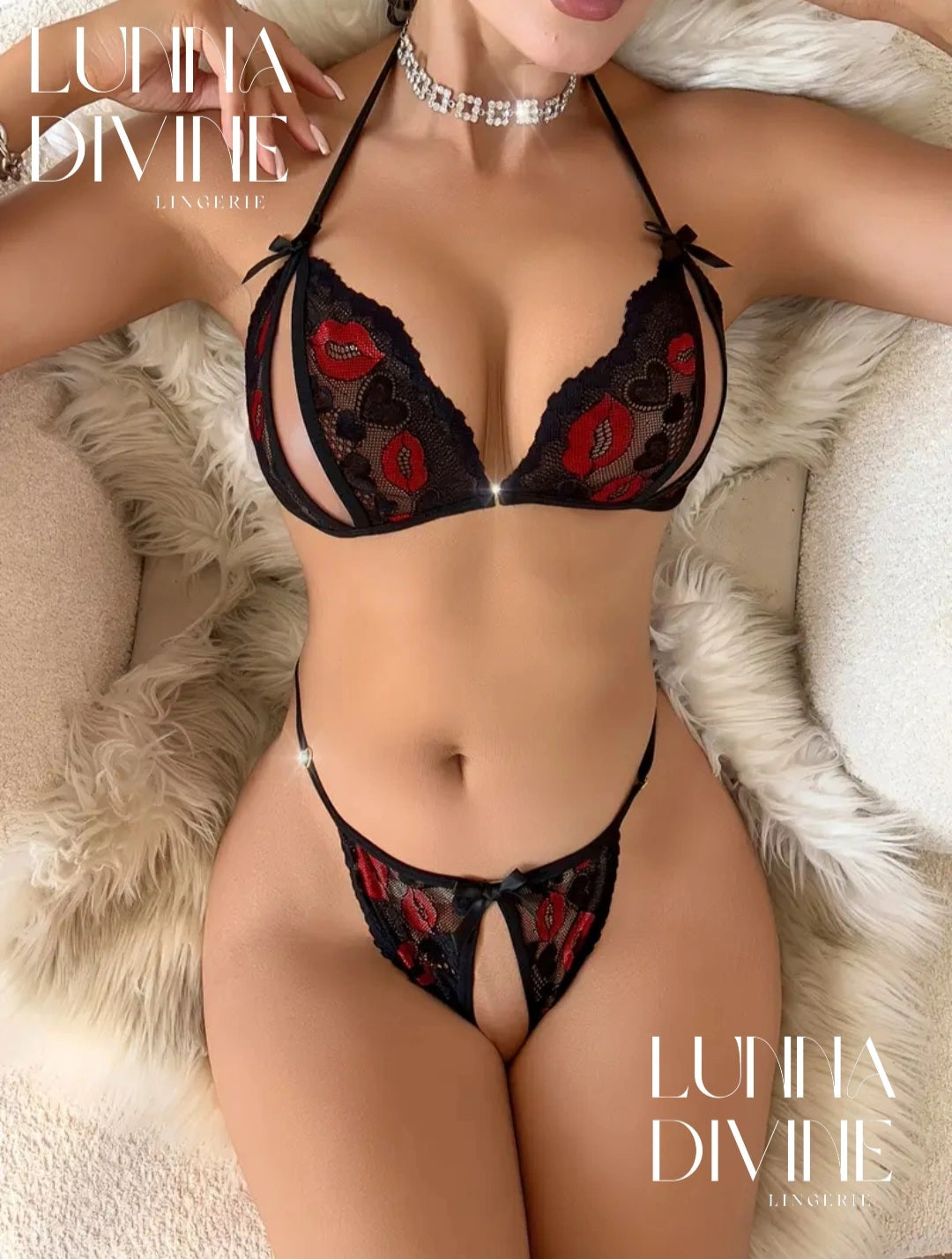 Ensemble de lingerie en dentelle avec impression de cœur et de lèvres, soutien-gorge ouvert et string ouverts, dentelle douce, soutien-gorge et string semi-transparents et séduisants, avec décoration de cercle d'or.