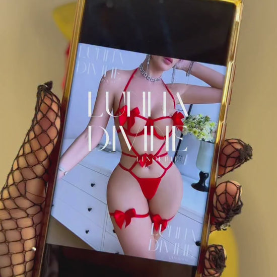 Ensemble Lingerie sexy rouge motif fleurs (avec anneaux de jambes).
