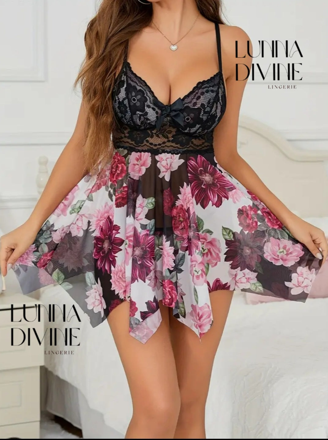 Robe de nuit asymétrique avec dentelle contrastante et imprimé floral, Avec string.